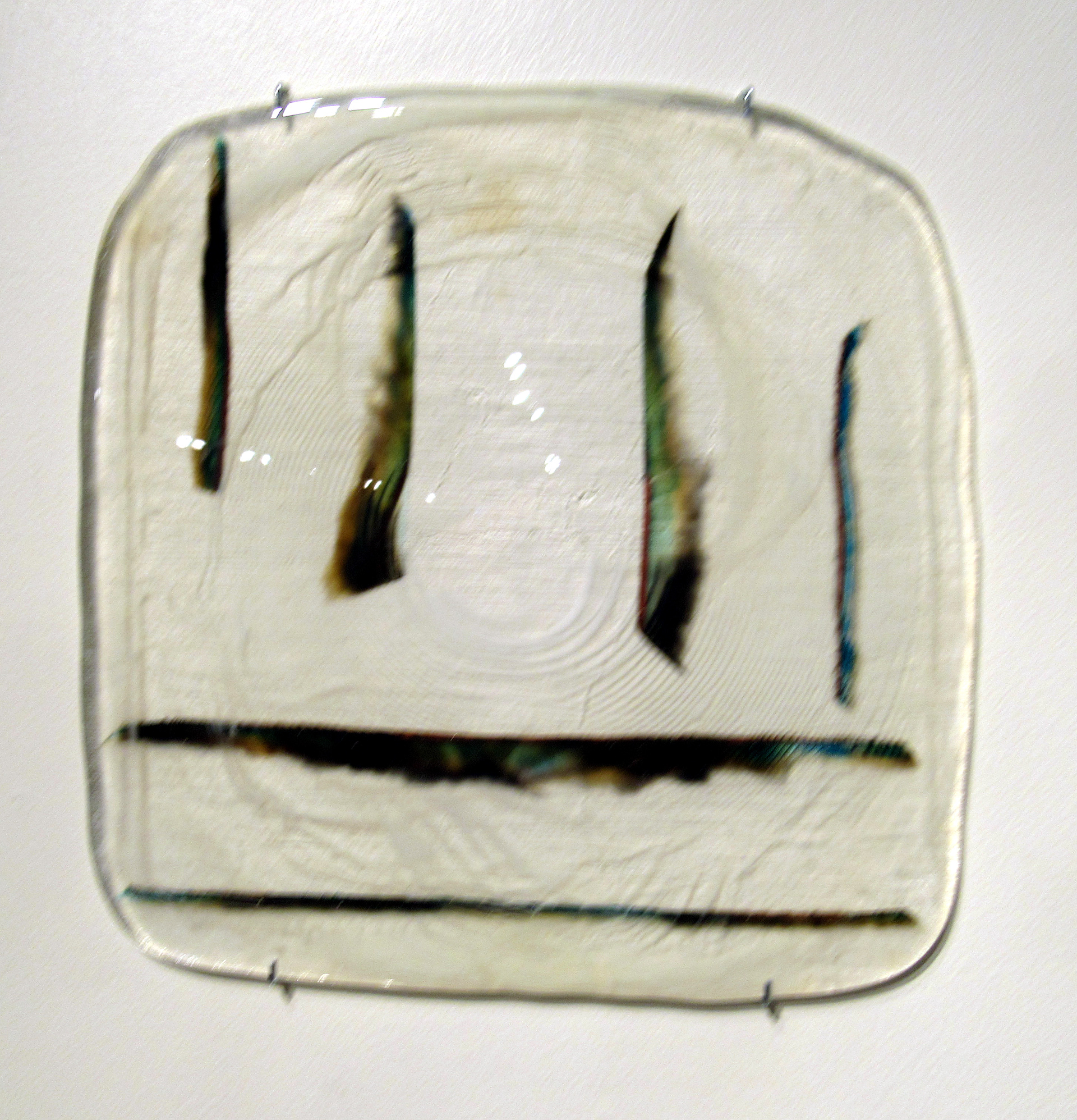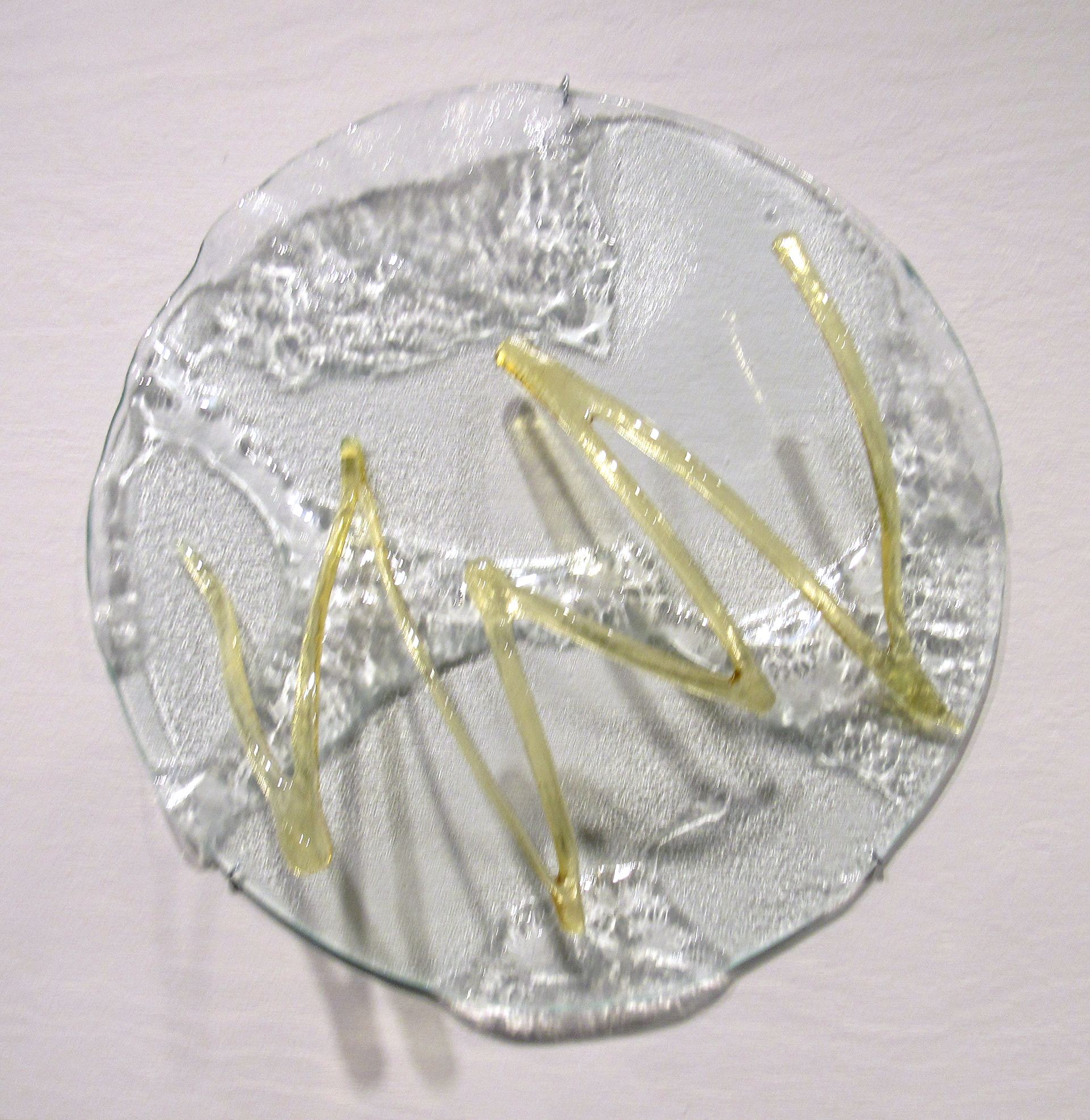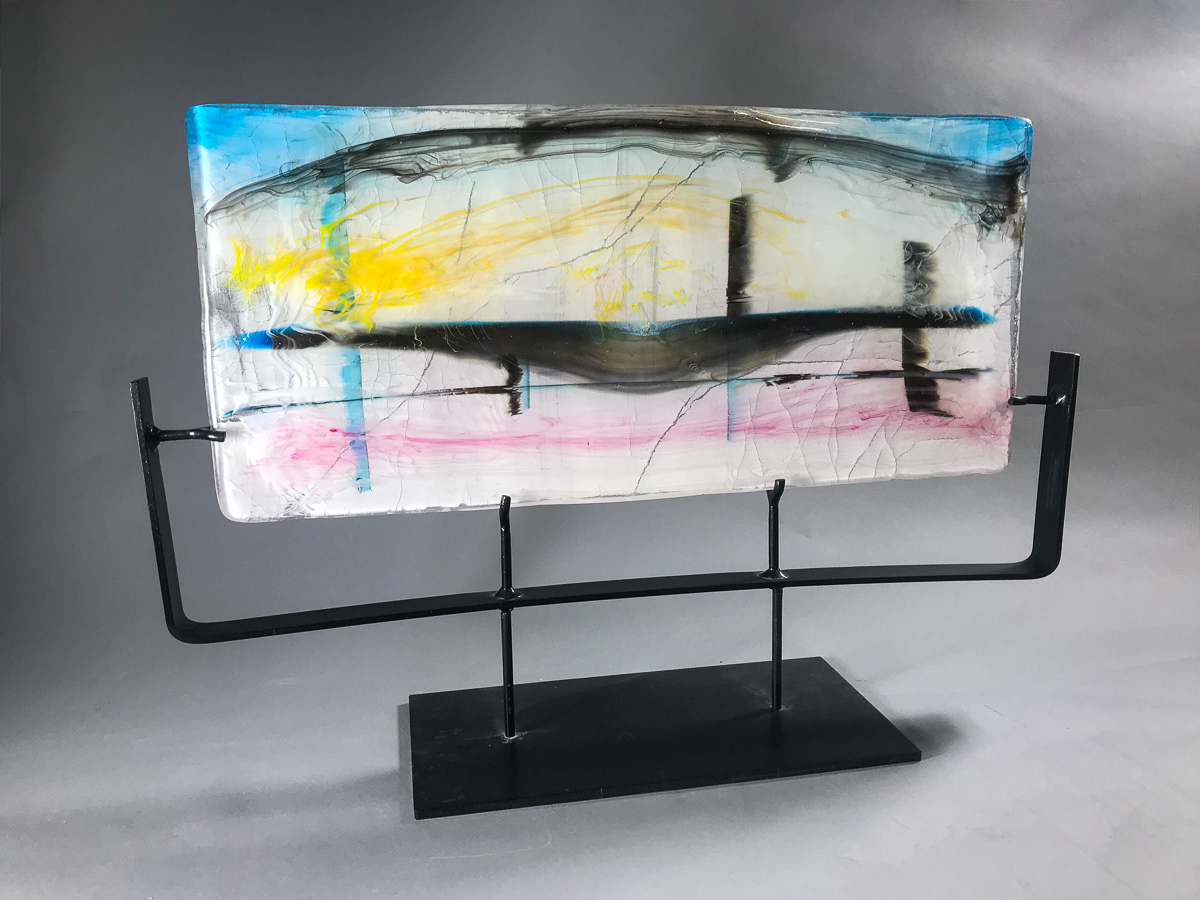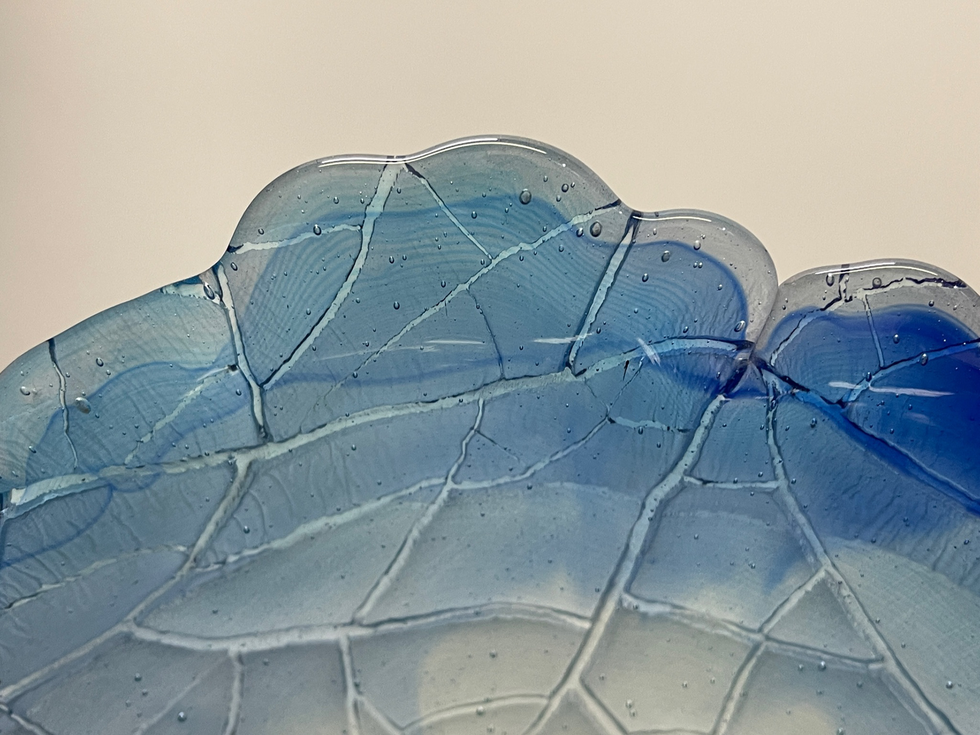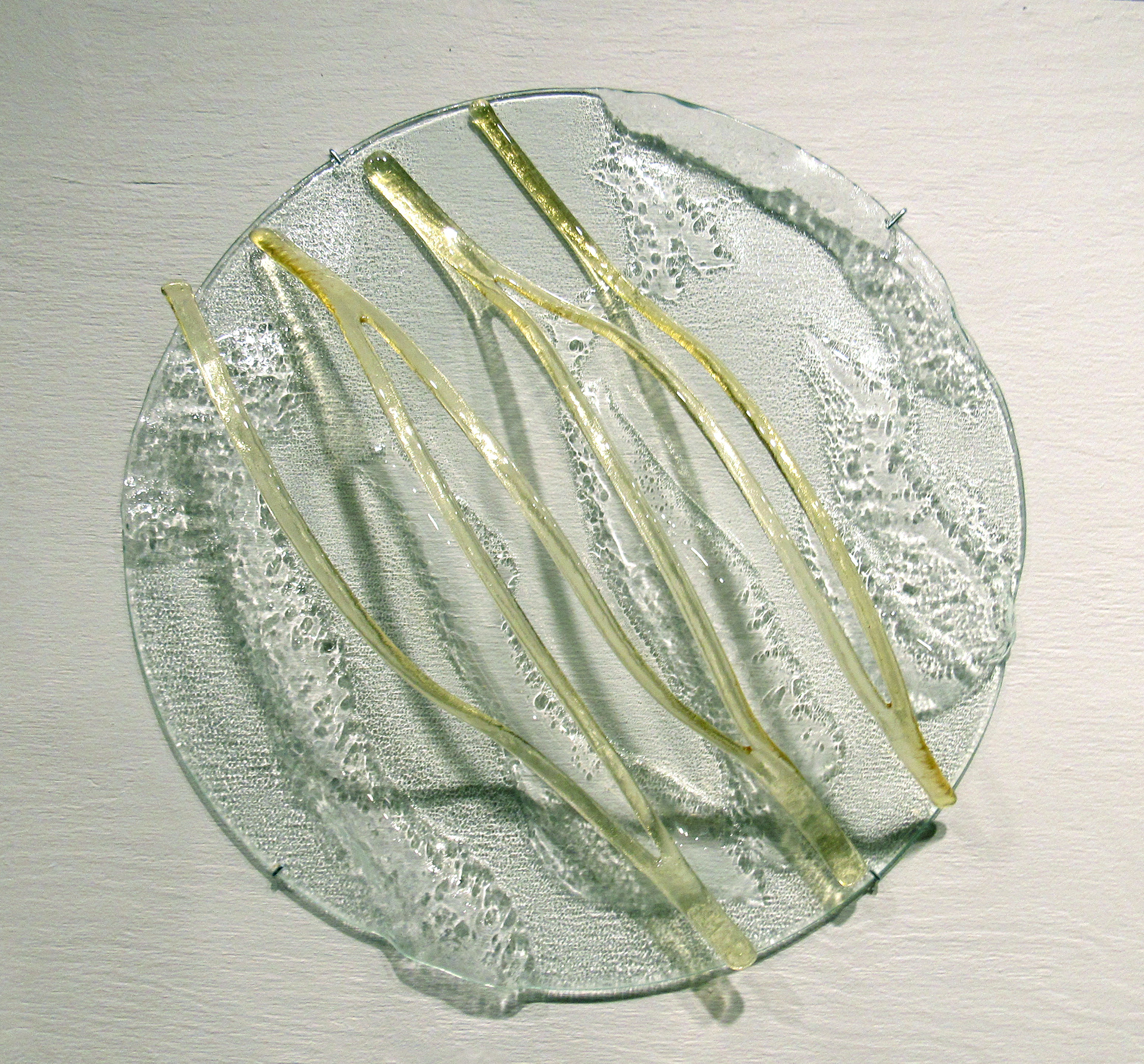 Fused and slumped Bullseye glass, sand carved salvaged glass