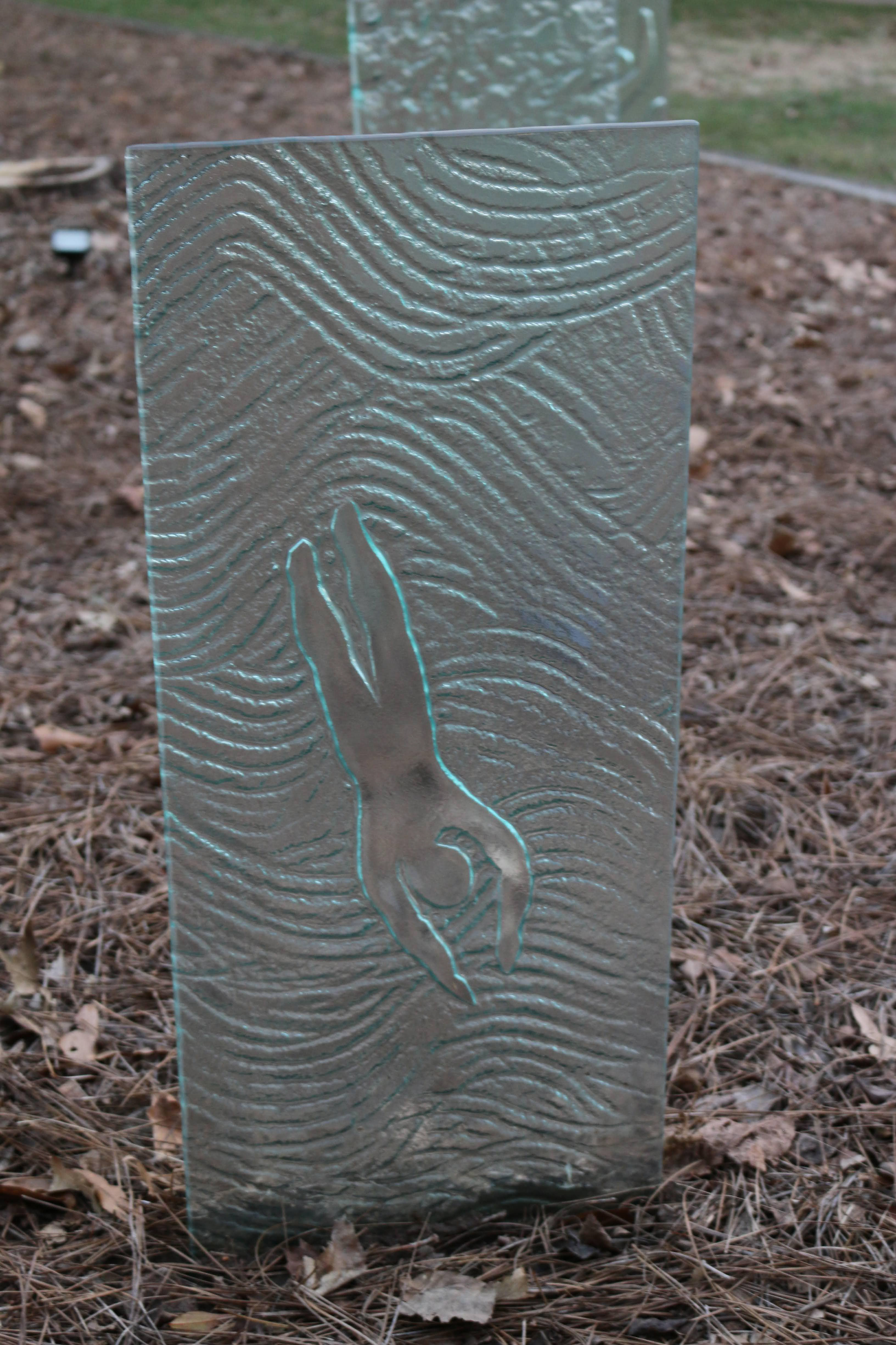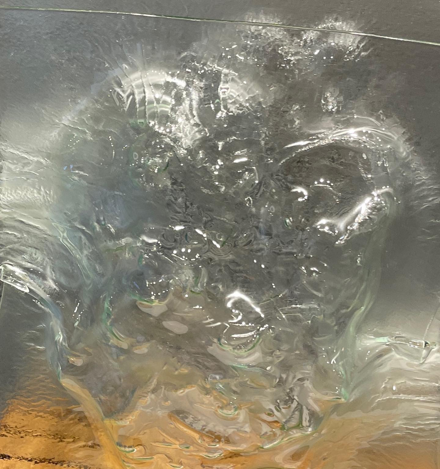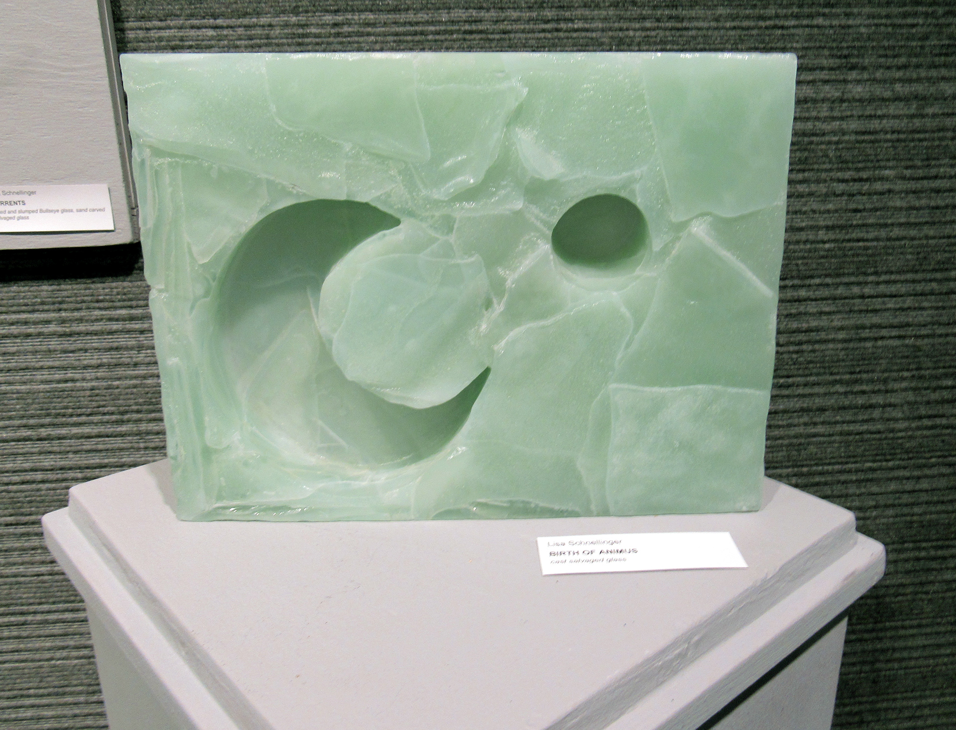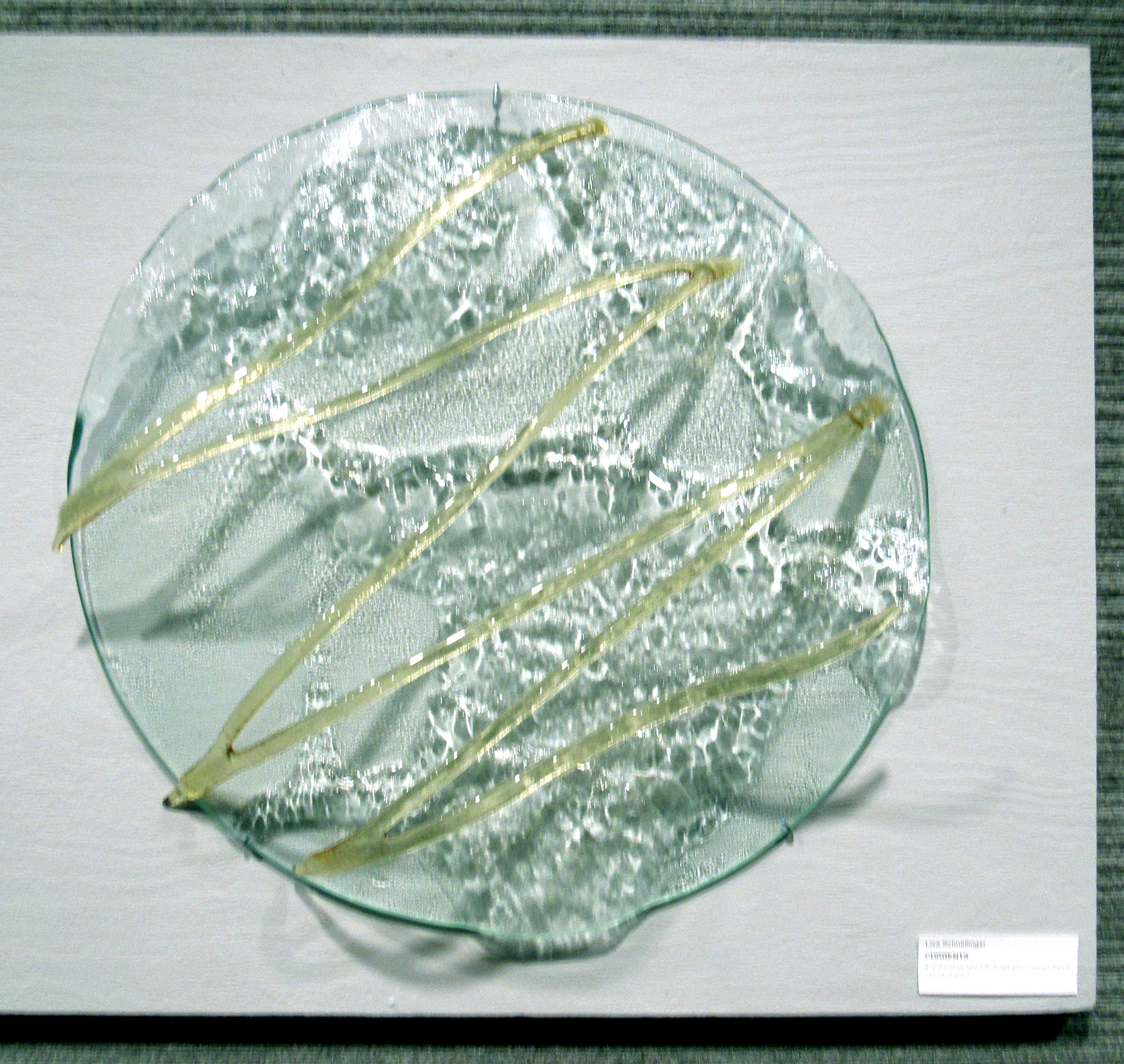Fused and slumped Bullseye glass, sand carved salvaged glass