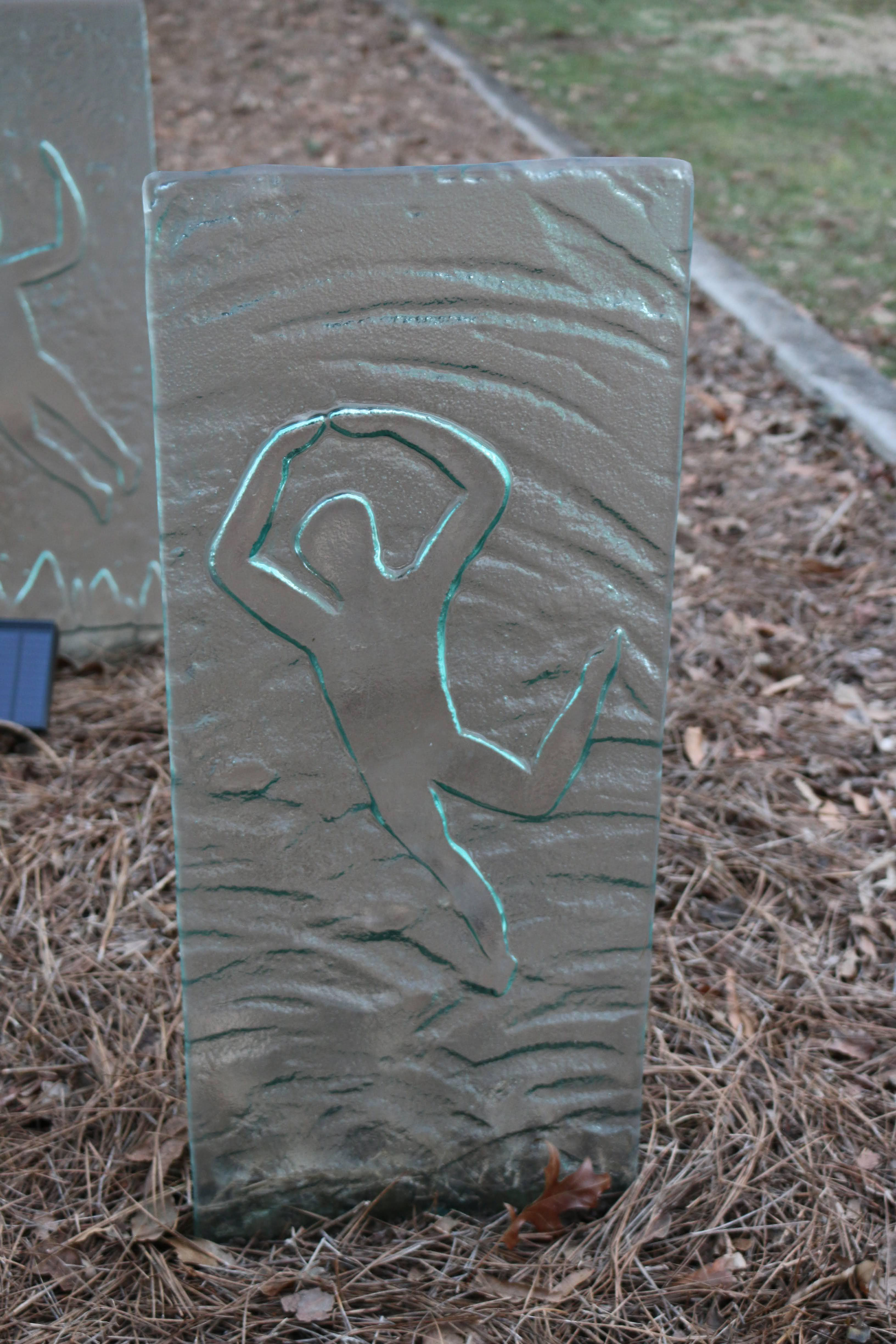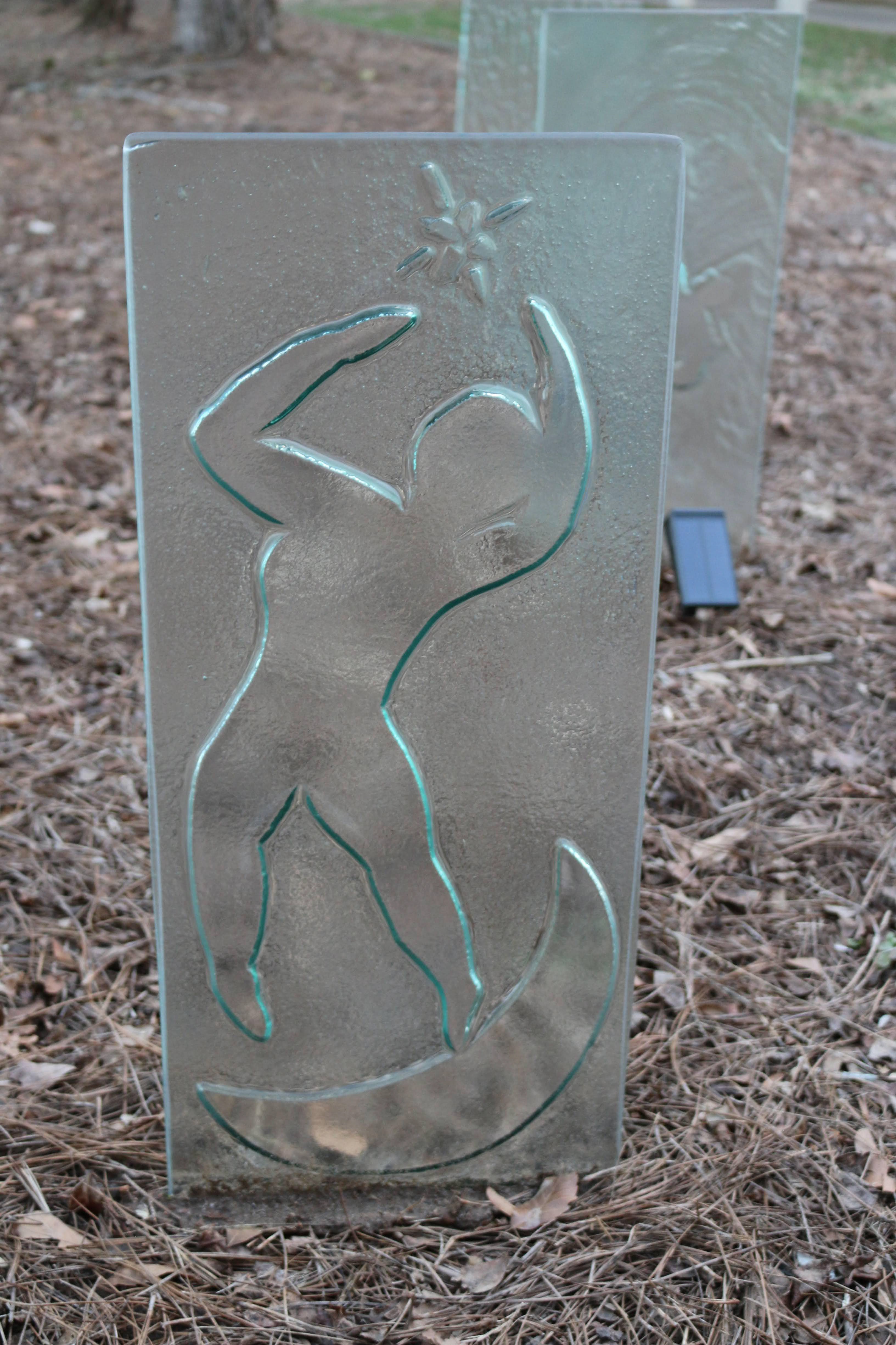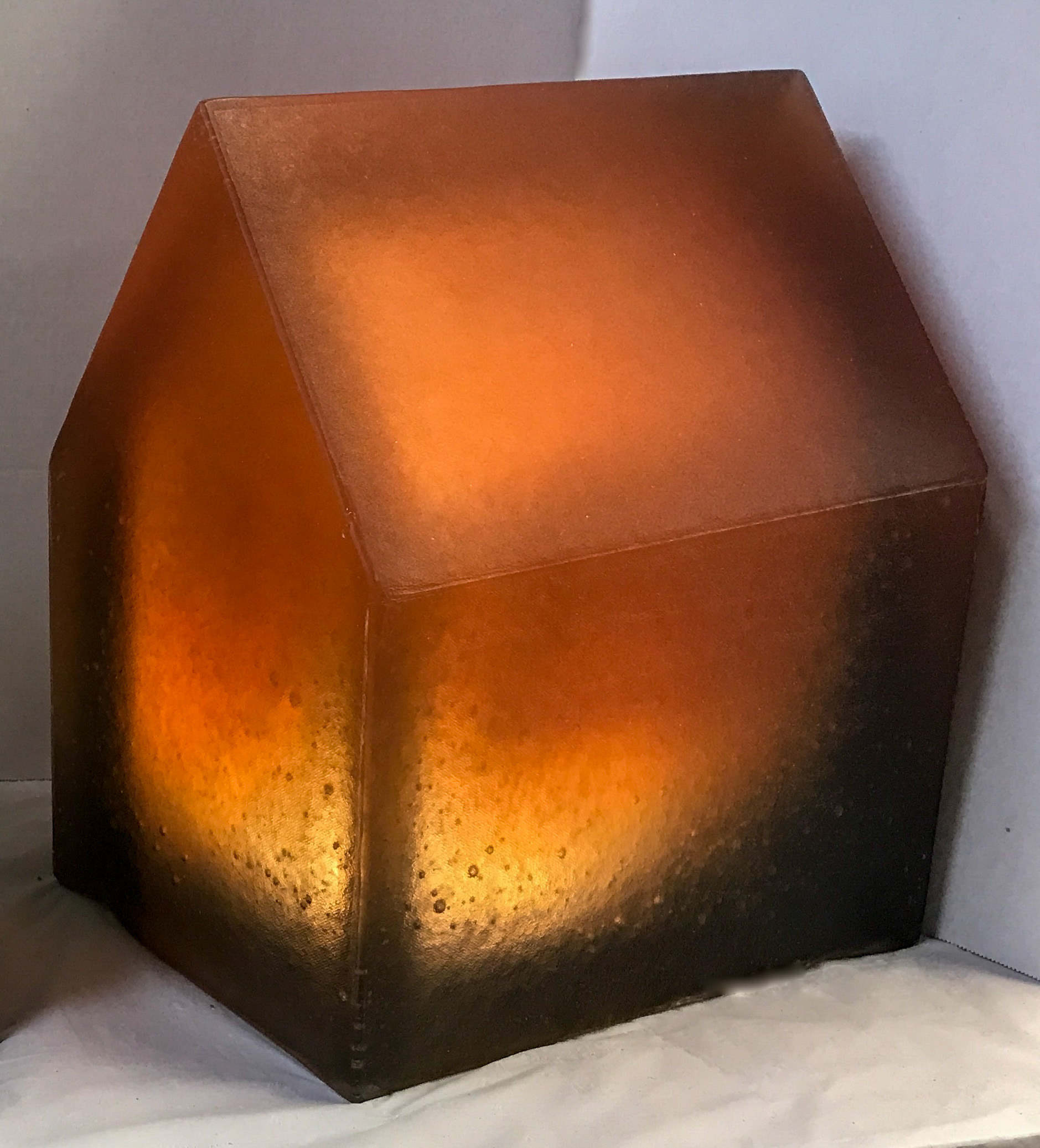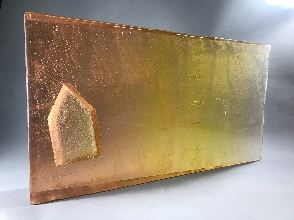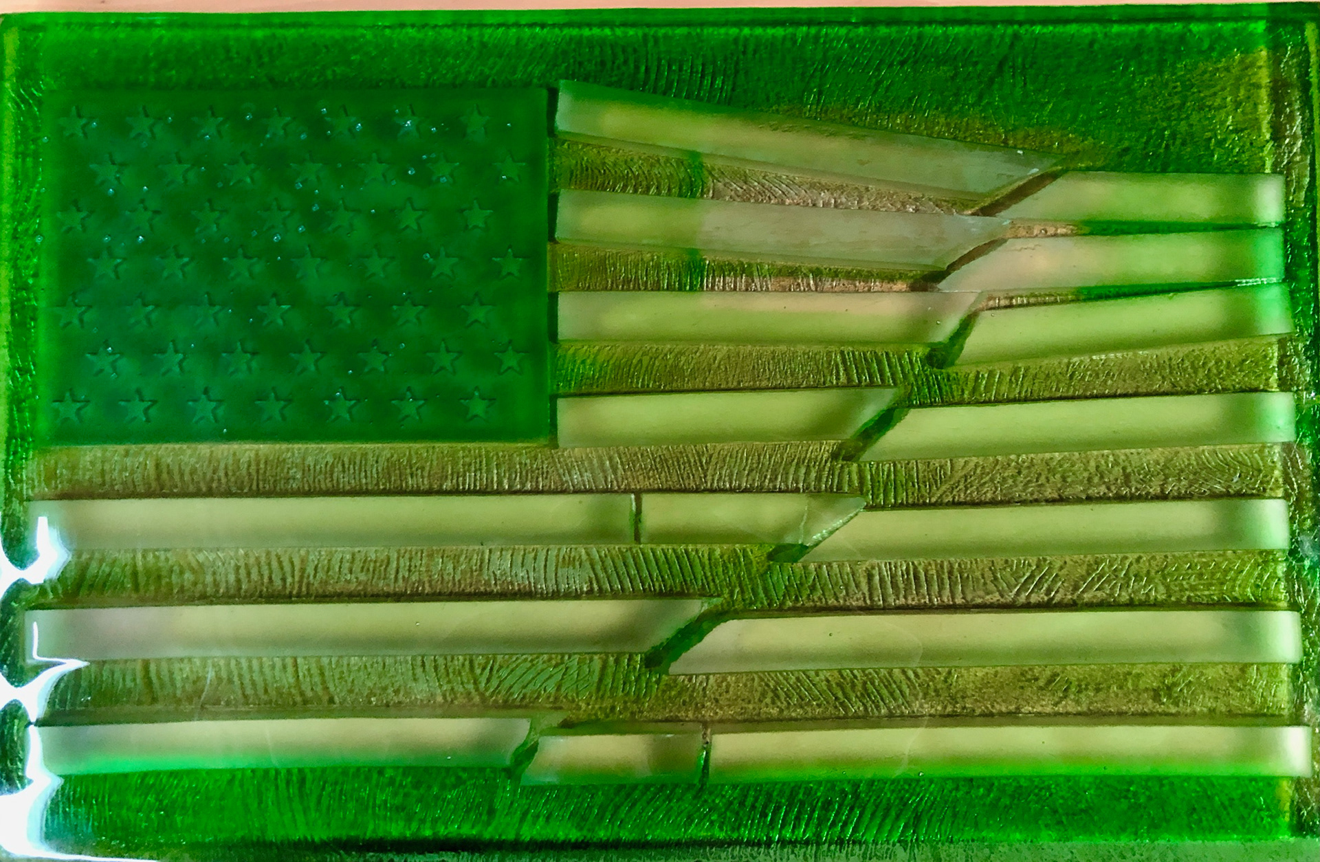 Fused and slumped Bullseye glass, sand carved salvaged glass
