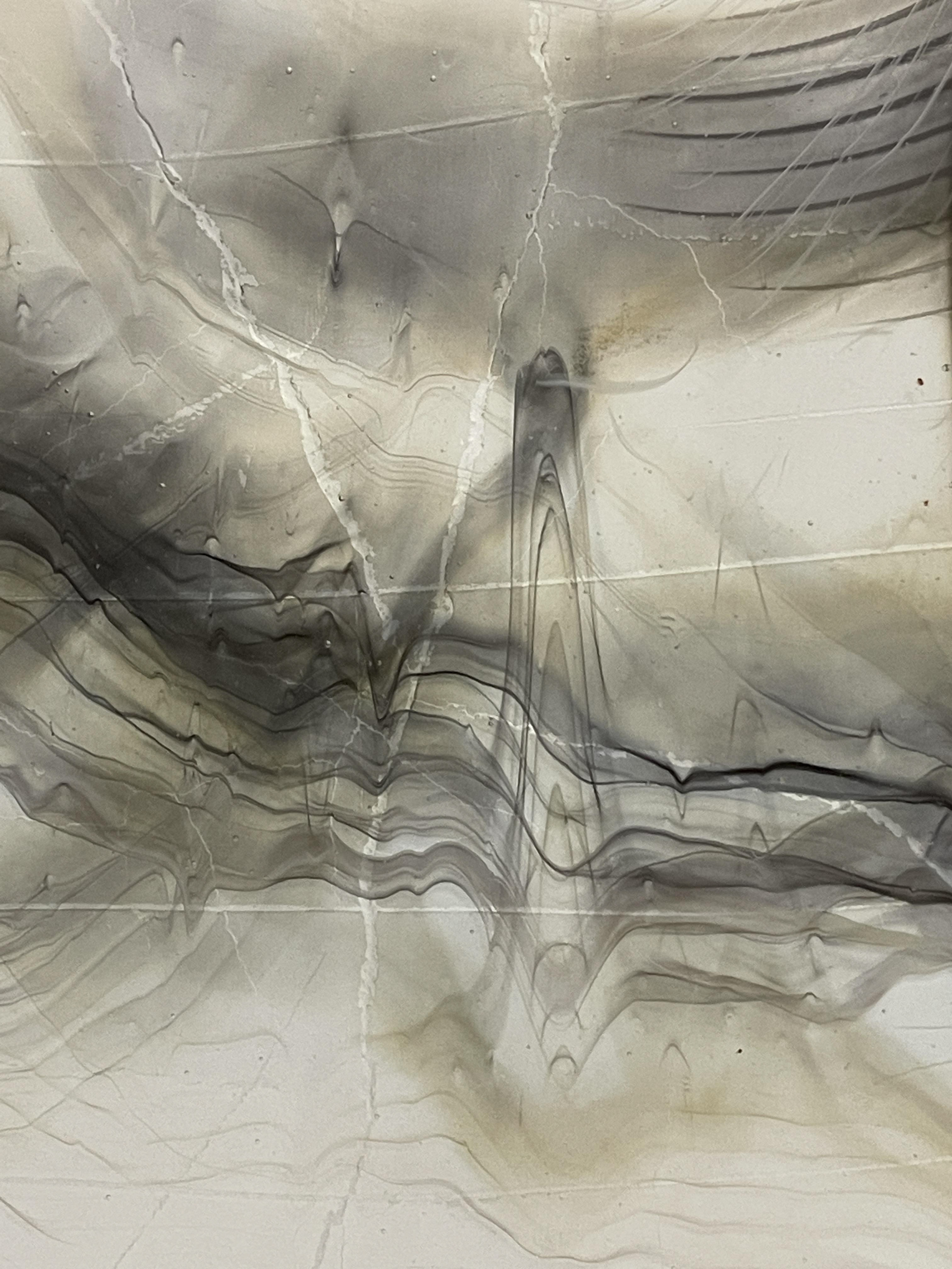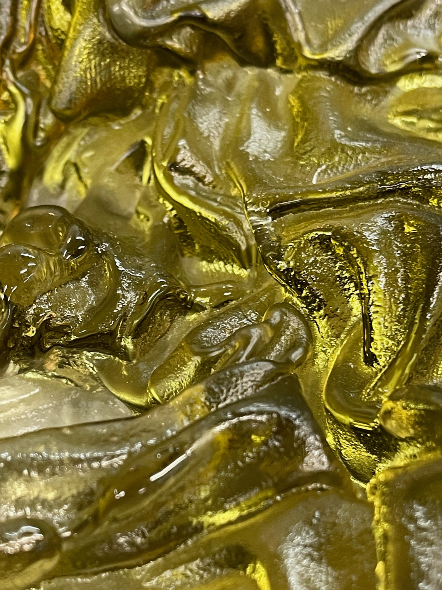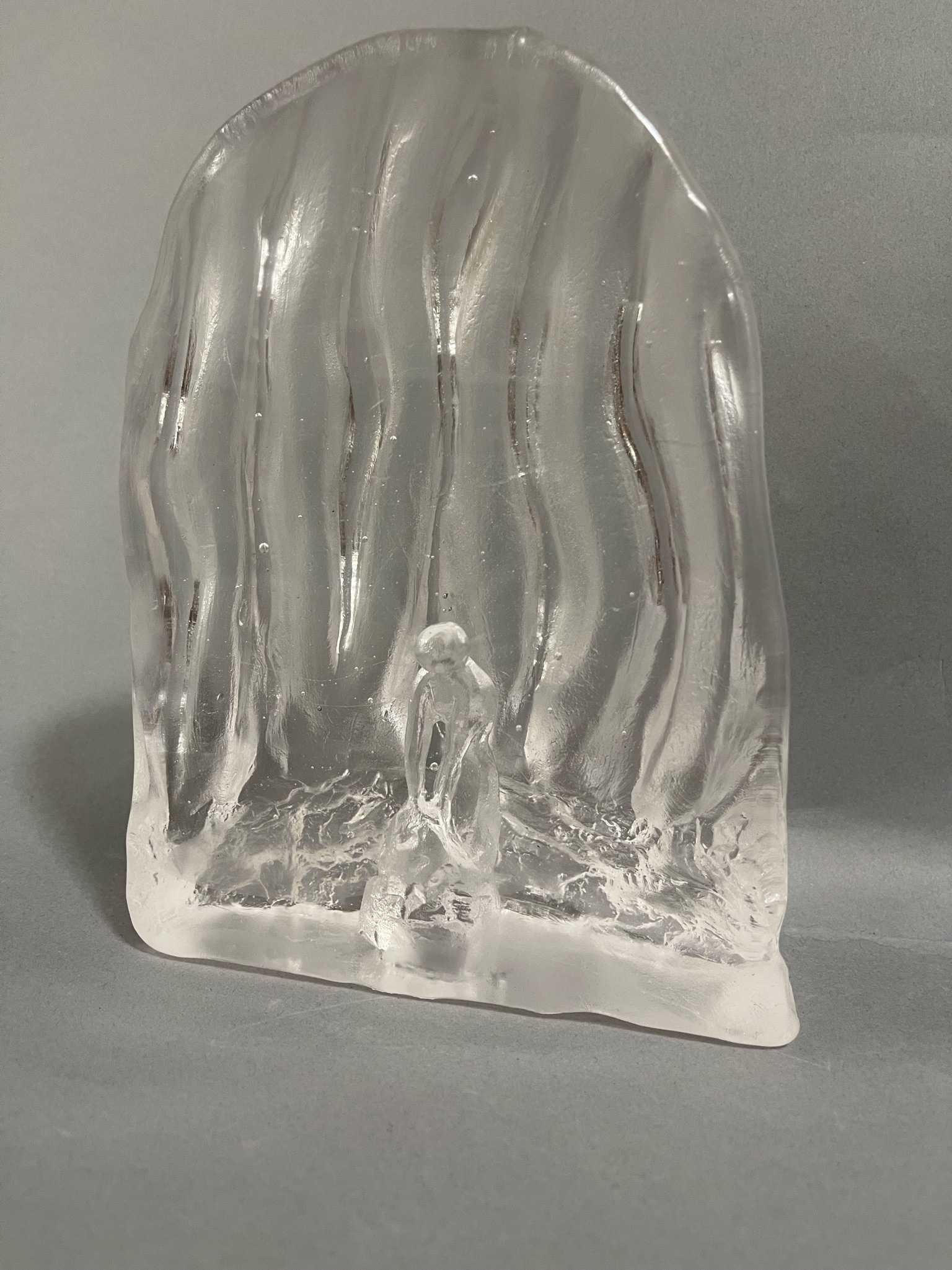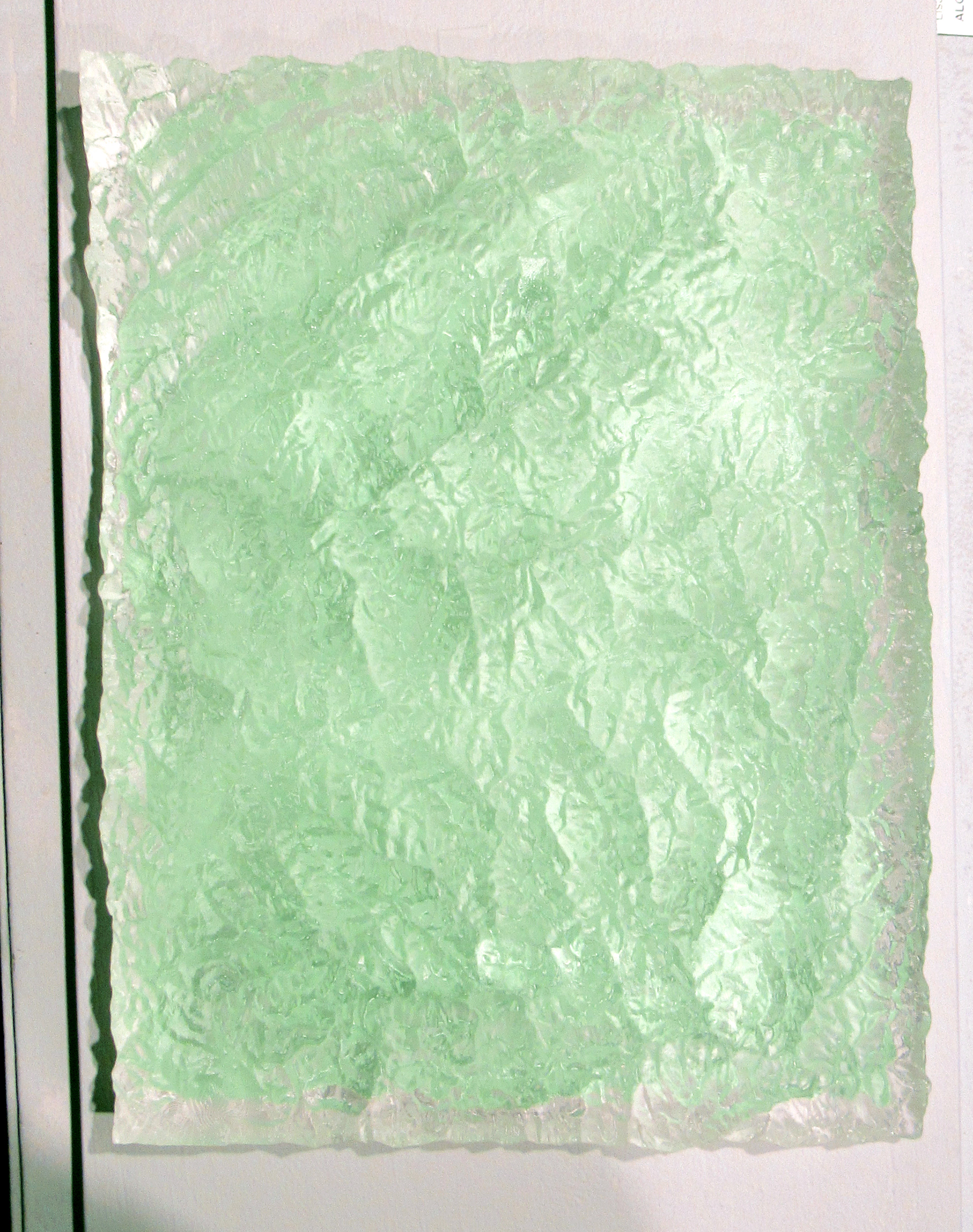 Fused and slumped Bullseye glass, sand carved salvaged glass