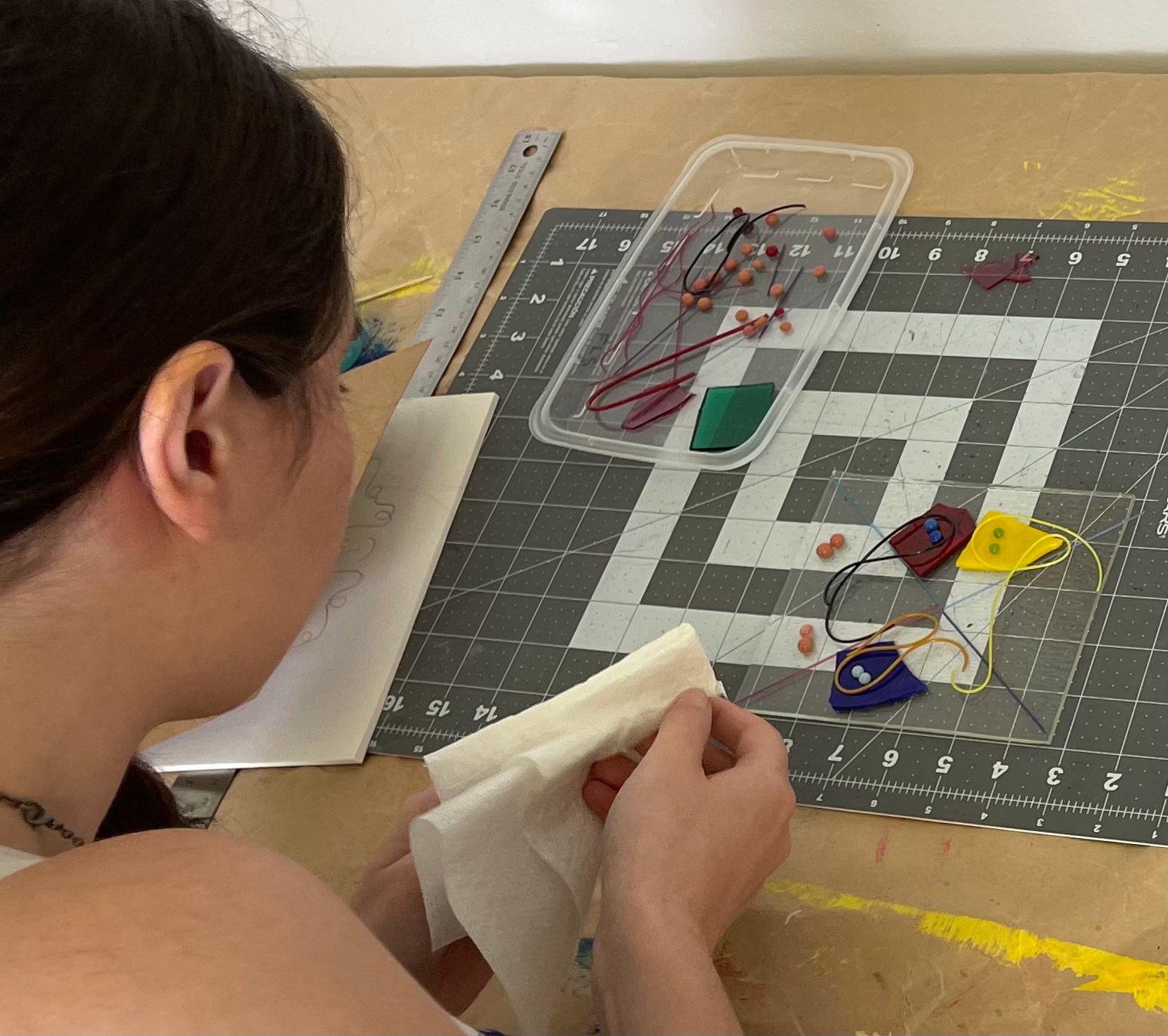 Art Department Chair Nell Ruby works on glass pieces for a future installation